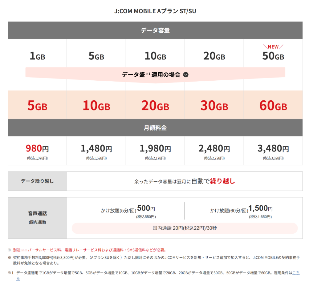 外出先でも動画をよく見る人にとって、通信速度とデータ容量は重要なポイントだと思います。J:COMモバイルは、コスパの良さと通信の安定性で人気です。この記事では、J:COMモバイルの料金プランや特徴を動画視聴の観点から紹介していきます。 料金プランと特徴 ※料金は2025年11月時点の情報です。最新の料金は公式サイトをご確認ください。 また、データ盛の適用条件も公式サイトをご確認ください。J:COMモバイルの「Aプラン ST/SU」は、データ容量と料金のバランスが取りやすいのが魅力です。条件を満たすと「データ盛」が適用され、1/5/10/20/50GBの各プランが5/10/20/30/60GBとして利用できます。例えばデータ盛適用時には、1GBプランで 5GB・980円(税込1,078円)10GBプランで 20GB・1,980円(税込2,178円)と、データ容量が多くなります。データは翌月に自動繰り越しできるため、動画の視聴時間が少ない月も無駄になりにくい点が実用的です。通話は5分/60分の定額オプションを選べるので、短い連絡が多い人は5分定額、通話時間が多い人は60分定額がおすすめです。 通信速度と安定性 J:COMモバイルはau回線を利用しており、通信品質が安定しているのが特徴です。実際の利用者の声でも「動画が止まりにくい」「昼休みでも快適」といった意見が多く、速度に対する満足度は高い傾向にあります。また、通信混雑時の速度制御も比較的穏やかで、SNSや標準画質の動画であれば問題なく視聴可能です。外出先でのYouTube・TVer・Netflixなども十分楽しめるレベルです。 動画視聴におすすめのプラン 動画を頻繁に見る人には、20GBまたは50GBプランがおすすめです。20GBプランでは高画質の動画を1日1時間程度見ても安心、50GBプランなら自宅Wi-Fiなしでも快適に使えます。容量が余った月も繰り越しできるので、無駄がありません。 まとめ J:COMモバイルは、料金の安さ・速度の安定性・データ繰り越しがそろった通信サービスだと思います。特に「家でも外でも動画をよく見る」「コスパの良いプランを探している」人にはぴったりです。初めて料金を抑えられるSIMを検討している人にも使いやすいのでおすすめです。 ※料金は2025年11月時点の情報です。最新の料金は公式サイトをご確認ください。